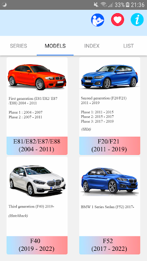 1 series : E81, E82, E87, E88, F20, F21, F40, F52