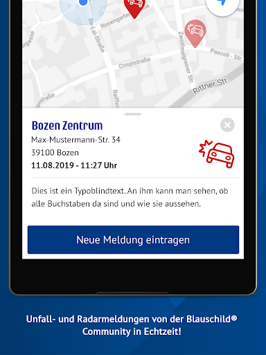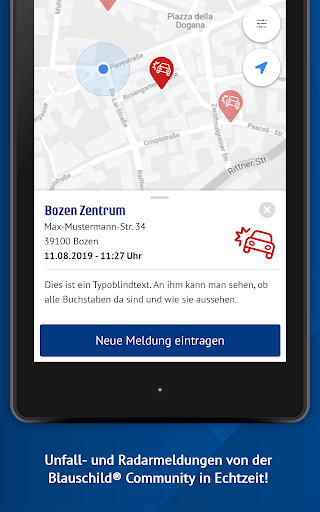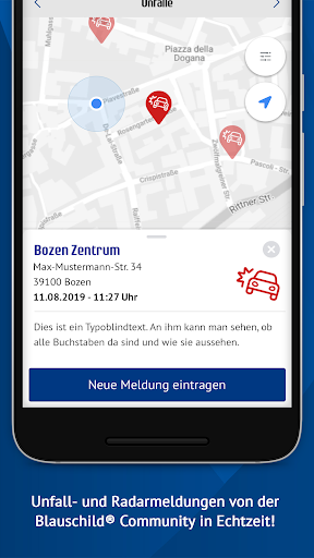 Die App bietet den Autofahren in Südtirol eine Platform um sich über Verkehrseignisse auszutauschen. Jeder Nutzer kann Verkehrsmeldungen eintragen und andere Nutzer so rechtzeitig über die Geschenisse auf Südtirols-Straßen informieren. So bleiben Sie und das gesamte Blauschild-Netzwerk immer und überall auf dem aktuellen Stand.