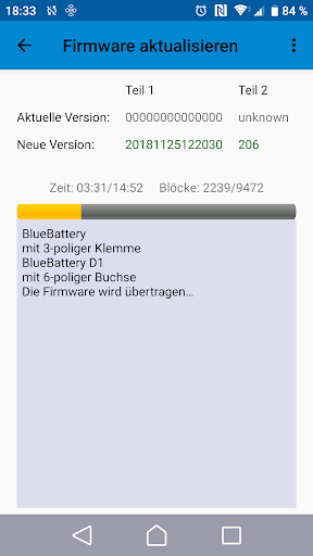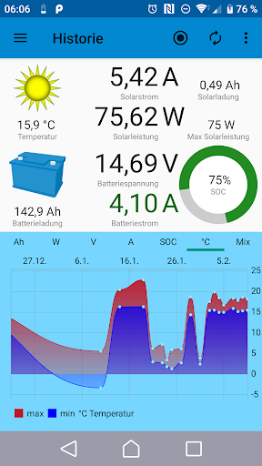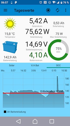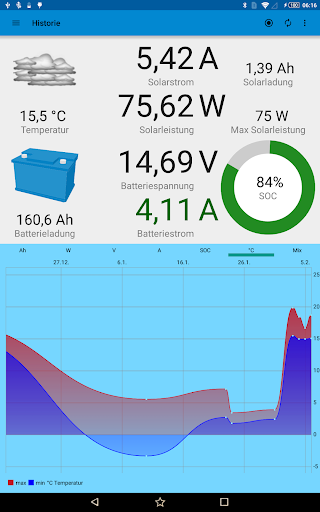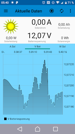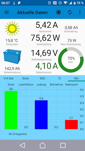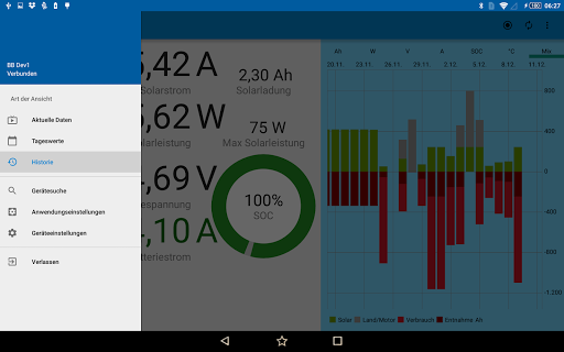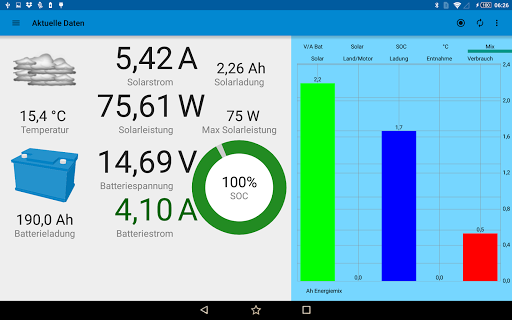Die ermittelten Messwerte der BlueSun- und BlueBattery-Geräte werden per Bluetooth von dieser App empfangen und dargestellt.