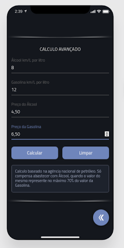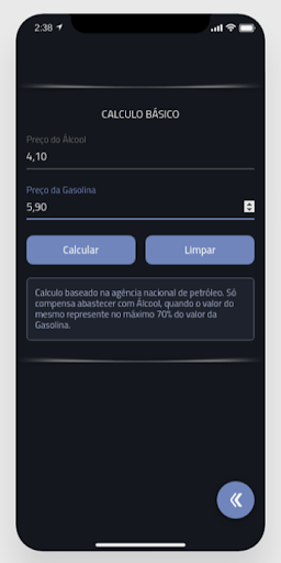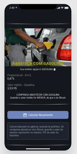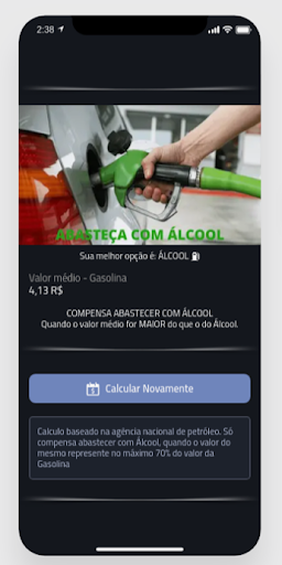 Você verifica de forma rápida qual mais vantajoso, abastecer com Álcool ou Gasolina.