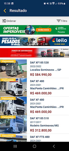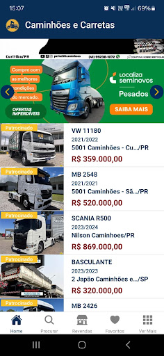 Olhar um vasto número de caminhões e carretas e opções disponíveis, com muitos detalhes sobre tudo o que está anunciado.