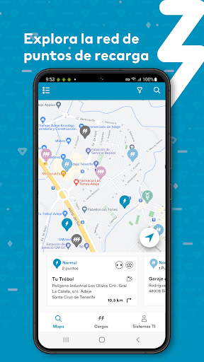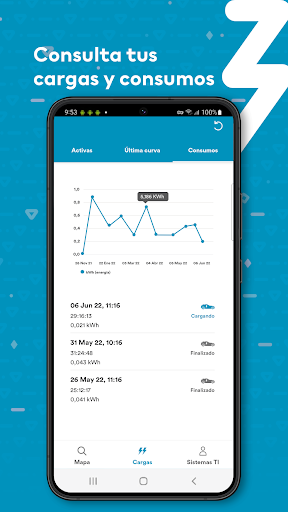 Todo lo que necesitas para gestionar la recarga de tu vehículo eléctrico en una sola aplicación móvil, fácil, sencilla e intuitiva: tiempo de inicio y finalización de carga en el terminal seleccionado, emisión de tíckets y de factura final, consulta de histórico de consumos…