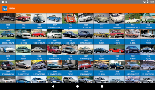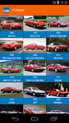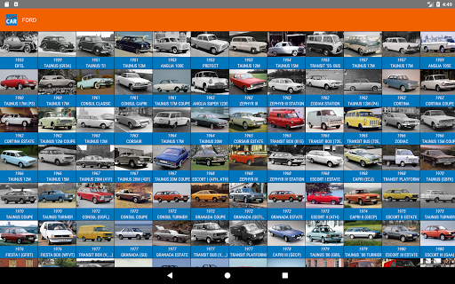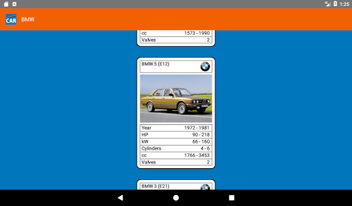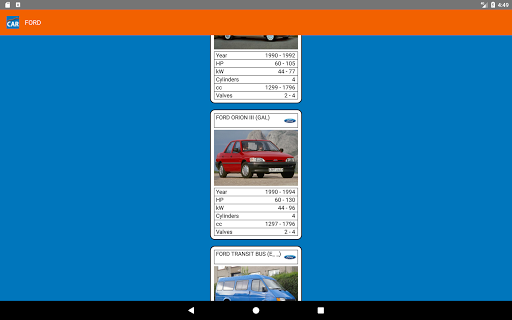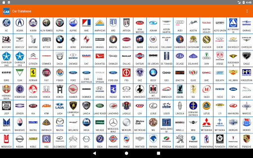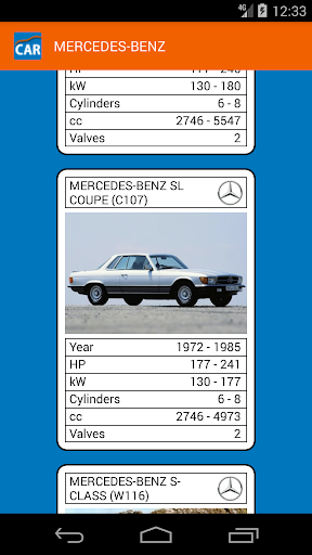 It contains information about more than 200 makes and 4000 models. Each model is represented by its image, years of production, available HP, kW, Cylinders, cc and valves per cylinder.