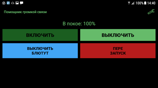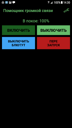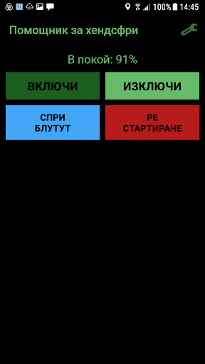 The main screen has 4 buttons: start, stop, turn bluetooth off, and restart.