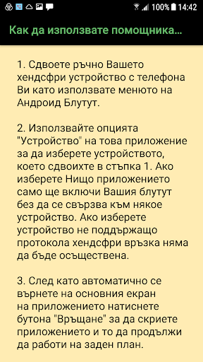 The application is a “fire and forget” tool – it works in the background, starts when installed and doesn’t need user input after initial setup. The user must manually pair his handsfree to the phone and afterwards set it as a target device in the application, which is a onestep precedure.