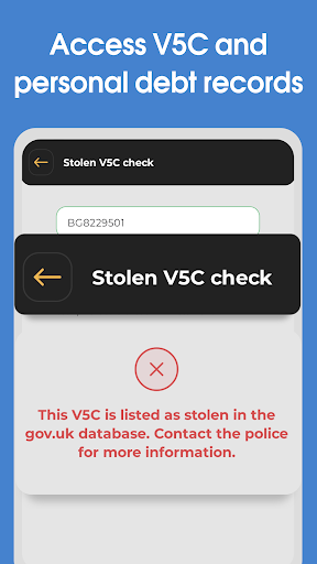 Our vehicle information app reveals the following information based on data provided by the Driver and Vehicle Standards Agency (DVSA), the Association of British Insurers (ABI), the Police, the Individual Insolvency Register, etc.: