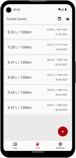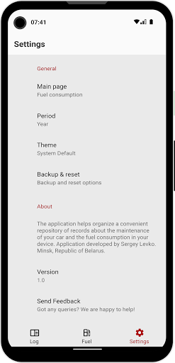 In Fuel section stored data about car fuel consumption. This section is usefull for people who have old cars which on-board computer do not calculate fuel consuption. Data stored in this section includes information about fuel consumption of the car, distance which the car passed after refueling and date when the car was refueled.