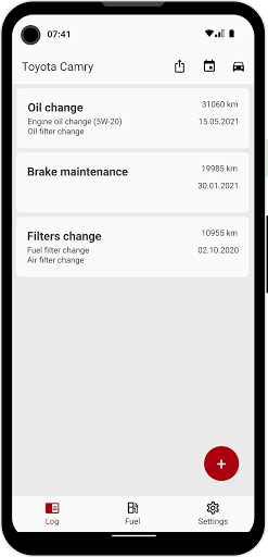 In Log section stored records about car maintanance. This records includes Title with short description, Mileage value, Date when works was made and Text with detailed description of performed work. This records can be exported by user to PDF file.