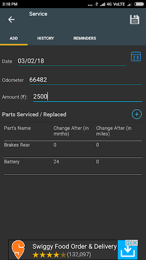 – Support for recording replaced vehicle parts like Battery, Tyre etc., during service