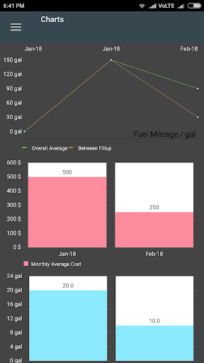 – Historical Chart View of fuel efficiency, Monthly Fuel Cost and Fuel Consumption