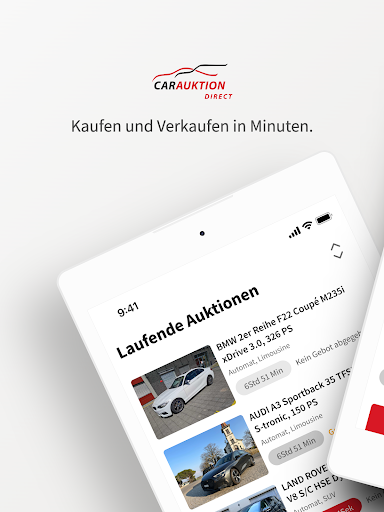 Versteigern und ersteigern Sie Fahrzeuge mit sehr kurzen Auktionslaufzeit. Sie erhalten eine Push-Notification bei neuen Auktionen und können im Blindauktionsverfahren Ihr Höchstgebot abgeben. Der Verkäufer entscheidet nach der Auktion ob er das Höchstgebot annimmt oder ablehnt.