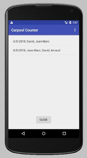 Carpoolers must be encoded. Afterwards, the trips are added. They are shown in the history of trips. For each trip, the app is giving and substracting points to each carpooler. The one with the more negative total should be the next to drive.