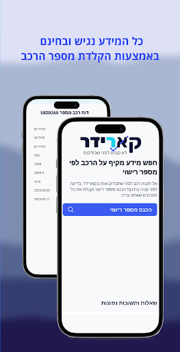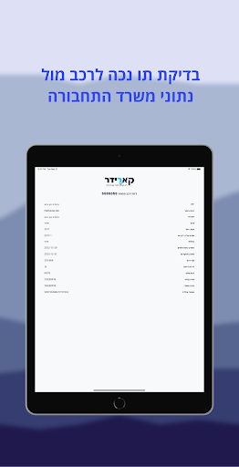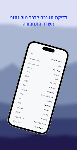 מציג מידע כגון: בעלות הרכב (חברה או פרטית), דגם צבע, מידות צמיג, חודש עליה לכביש, משקל כולל, תאריך טסט אחרון, קוד דגם, כושר גרירה, רמת אבזור בטיחותי, דרגת זיהום ומידות הצמיגים, האם קיים תו נכה ועוד..