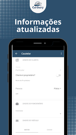 A Car Story tem o intuito de ajudar os vistoriadores no ato da vistoria, tendo um layout extremamente simples, e intuitivo. Pensando nos problemas do dia a dia, preparamos este aplicativo para que também funcione off-line, dando a tranquilidade que será possível fazer o laudo, independentemente de onde estiver, e assim que tiver conectado à internet, transmita. Tudo simples e confiável. Para ter acesso basta entrar em contato com a Car Story para fazer seu cadastro, e comece a faturar.