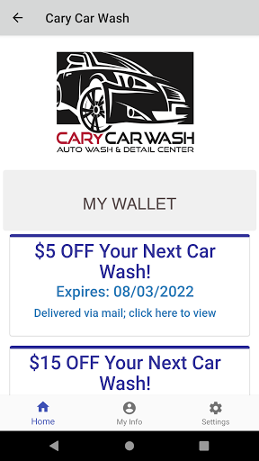 The Cary Car Wash Loyalty mobile app delivers offers and loyalty information to on-the-go customers, giving quick access to exclusive deals, enrollment options, loyalty point balance and rewards lookup, loyalty program information, and information about our business-