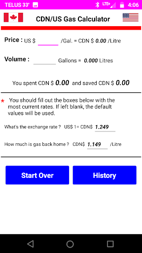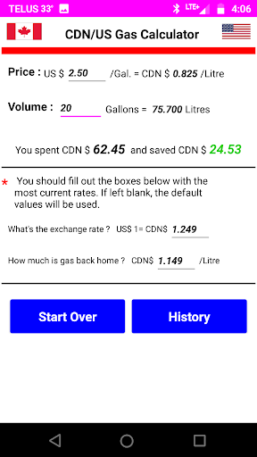 It does all the conversions for you, including gallons to litres and CDN $ to US $, taking the exchange rate into account.