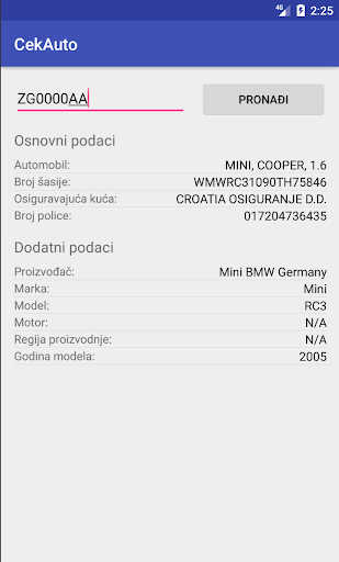 Upiši registraciju vozila za kojeg želiš saznati informacije kao što su osiguravatelj, broj šasije, model, tip motora i mnoge druge.