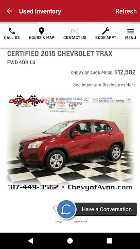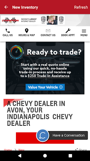 Chevy Of Avon mobile customer engagement app provides customers with an enhanced dealership mobile experience. The app uses background geo-location for geo-fencing and geo-targeted push notifications to provide customers with relevant specials and loyalty offers. The app also delivers a wide range of features/benefits to customers, including service scheduling, viewing new and used inventory, redeeming mobile offers, sharing dealer promotions, viewing special events, contacting roadside assistance, booking a test drive, and contacting staff directory.