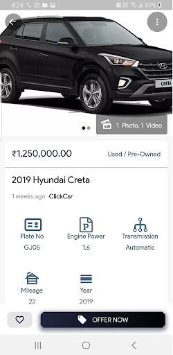 ClickCar app provides a completely online used car buying and selling experience, Click Car goal is to connect buyer and seller directly and help them to negotiate the price and payment condition as well as to help in name transfer RTO related paperwork.