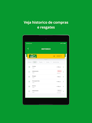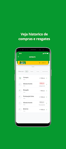 Para consultar o seu histórico de compras e resgates, acesse Extrato. Por lá você pode filtrar por Abastecimento, Compras, Resgates e outros.