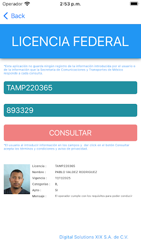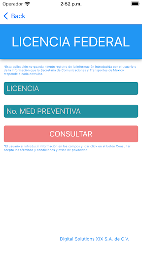 La App consulta directamente con la secretaria de Comunicaciones y Transportes si una licencia federal existe y si esta vigente, la Secretaria de Comunicaciones y transportes (SCT) es la duela de la información presentada en cada consulta y la App no guarda la información del usuario ni la respuesta de la SCT, la app no pertenece a la SCT solo hace uso de su API oficial de dicha institución.