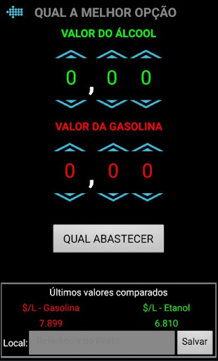 – TELA ABASTECER: A ajuda na decisão de qual abastecer; indicando qual combustível é o melhor custo-benefício;(guarda últimos valores e o local)