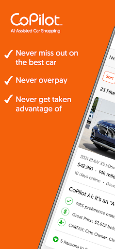 CoPilot takes the stress out of car-buying. There’s no trick prices or bait-and-switch tactics, just simplified, unbiased, AI-driven insights on each car, and what the Carfax means. CoPilot is independent, honest, and always 100% free. Not just a free trial, but a truly free app. No upsells or premium subscriptions.