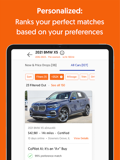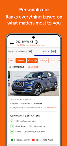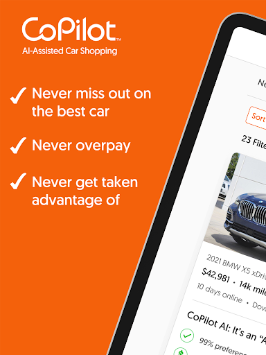 Shop with confidence with CoPilot’s AI-Assisted car shopping app for new and used cars, trucks, minivans, SUVs, EVs & hybrids. CoPilot searches every car at every dealer, every day, pulls together all the information in one place, analyzes every car in seconds, and ranks them based on what matters to you.