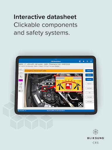 Using an interactive top- and sideview of the vehicle, the exact location of rescue-relevant vehicle components is shown. Clicking on a component shows detailed information and self-explaining photos.