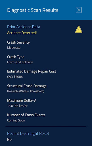 If the “CrashScan” is successful, the report will provide details on impact severity, impact orientation (front/rear/side impact), and provide context, such as: