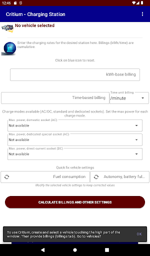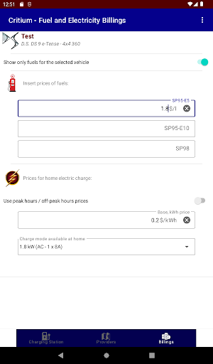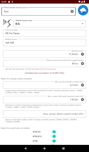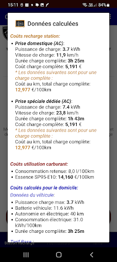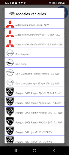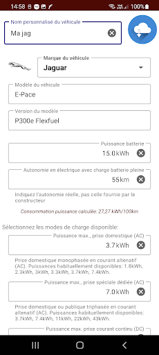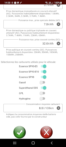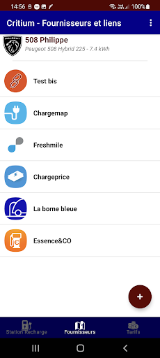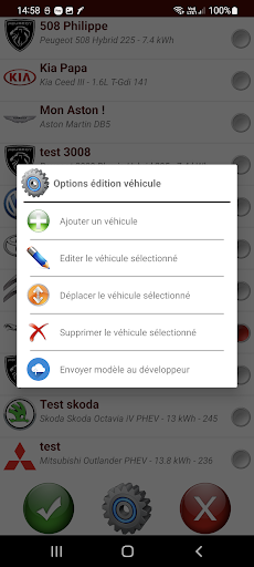 The app lets you keep a list of shortcuts to apps that help you manage charging and fuel costs. Some applications are recognized automatically. You can report others by emailing the developer. Similarly for vehicles, you can send the parameters of unknown vehicles (the electric range must however be that declared by the manufacturer in WLTP mode. The fuel consumption is that once the battery is empty).