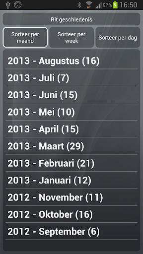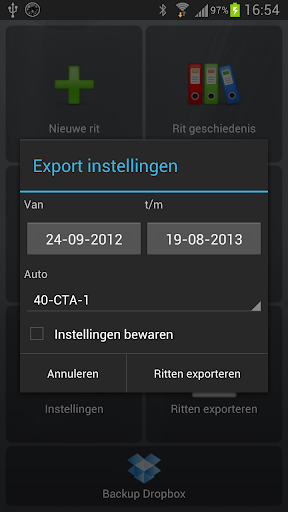Alle opgeslagen ritten zijn eenvoudig terug te kijken en te exporteren naar een Excel bestand. Ook kunt u alle data uit de app exporteren en wederom importeren voor backup doeleinden.