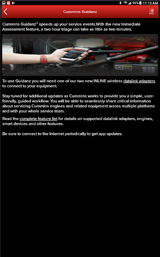 To use Guidanz you will need a Cummins INLINE™ datalink adapter. Simply plug either the INLINE 7 or the new INLINE mini wireless adapter into the J1939 connector on the vehicle or equipment, and then connect to your phone or tablet via Bluetooth®. For more information or to purchase adapters, visit https://www.cummins.com/parts-and-service/digital-products-and-services/inline
