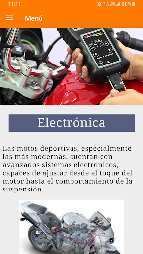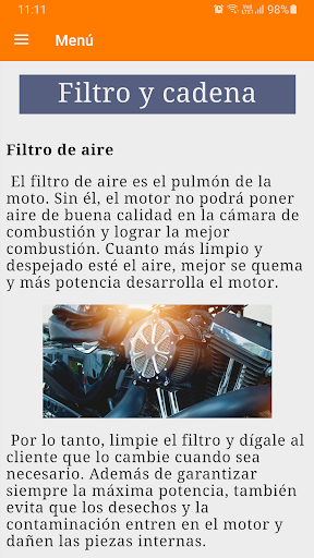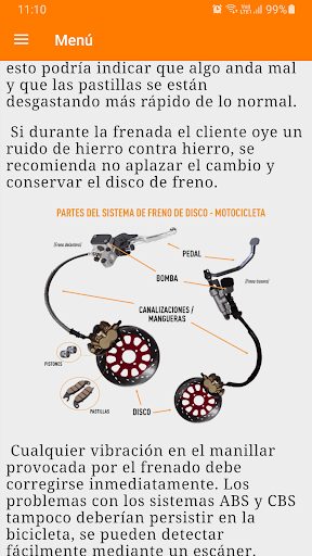 La app “Curso de mecánica de motos” te trae un manual de instrucciones que te enseña cada una de las partes más importantes de una motocicleta y la relación existente entre ellas, para lograr el correcto funcionamiento de la misma. Si tu moto tiene algún problema, detéctalo y una vez que encuentres la solución dentro de esta aplicacion, podrás conocer qué herramientas podrías necesitar para arreglaro, además de los pasos a seguir por supuesto.