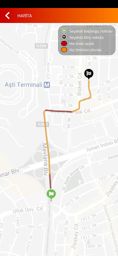 Yolculuk analiz raporları. Yolculuğun süresi, mesafesi, en yüksek hız ve ortalama hız verilerinin gösterimi.