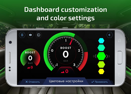 – DashMatic allows you to customize colors of all interface elements and naturally fit them into the interior of any car without any restrictions.