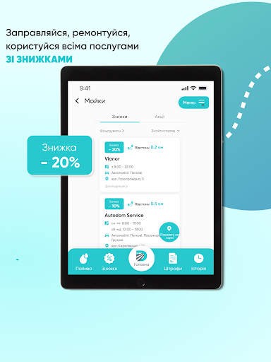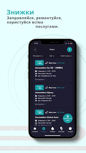 Заощаджуй на пальному від відомих АЗС до 3,5 грн на літрі, оплачуй швидко штрафи, користуйся знижками на мийках, СТО, шиномонтажах, детейлінгах, запчастинах та страховках. А також купуй вигідно собі авто з нашим всеукраїнським застосунком!