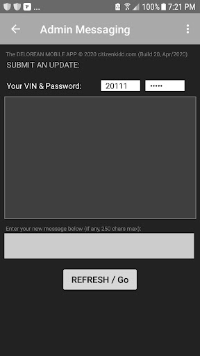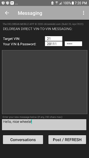 A messaging tool is provided, that will allow any member of the DeLorean Owners Directory to send a private message up to 250 characters directly to another DeLorean VIN. Senders have already been vetted by already being in The Directory. If the recipient VIN owner is also a member of The Directory, that person can immediately receive the message. If the VIN owner is not a member of the directory, they can still view the message once they sign up in the DeLorean Owners Directory.