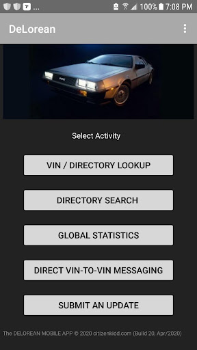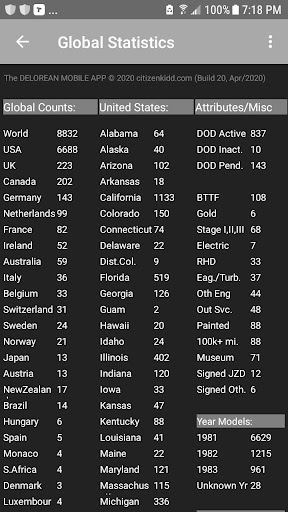 This application also displays global counts of DeLorean last known locations around the globe, listed by country, state or province, city, and finally by VIN. Searches can also be done by owner last name, if known.