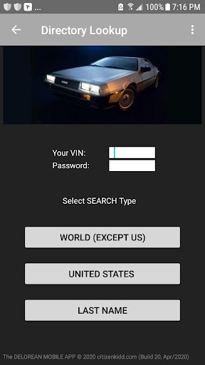 Additionally, this application searches the DeLorean Owners Directory for those vehicle owners who have elected to be listed in the directory, and who have agreed to have certain information released to other members of the directory. This option is ID and Password protected. Requested member contact information, and preferences are displayed only to verified members.