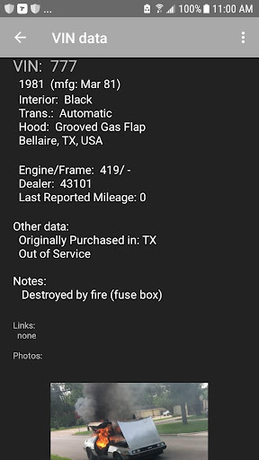 This application searches the Texas DeLorean Club VIN database of all known DeLoreans to have been built, for a specific vehicle. DeLoreans are numbered from 1-20105, based on the last 5 digits of the true VIN. Basic public vehicle build information is displayed.
