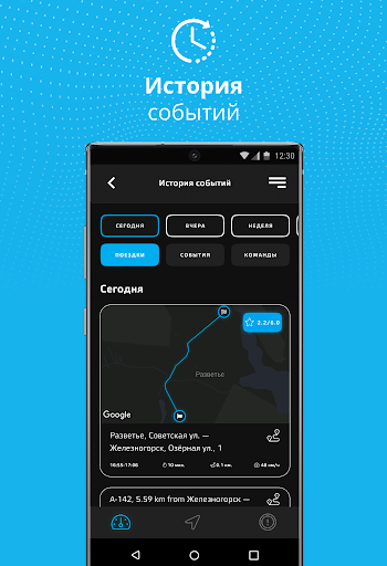 – просматривать историю поездок и всех событий на маршрутах автомобиля