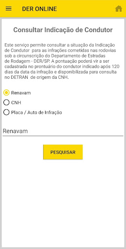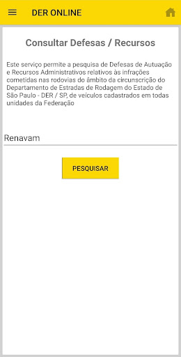 Este aplicativo é uma iniciativa do Departamento de Estradas de Rodagem – DER e propicia consulta rápida e eficiente, disponibilizando a situação atualizada das funcionalidades citadas acima, e também imagem da respectiva multa, a partir do RENAVAM do veículo. Para Multas de Embarcador está disponível também consulta por CNPJ/CPF.