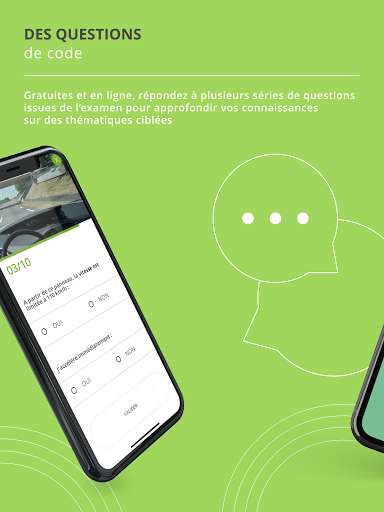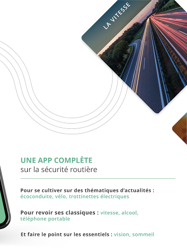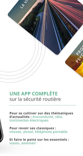 Grâce aux questions de Code de la route présentes dans l’application, chacun peut commencer à apprendre le Code de la route ou se mettre à jour sur les thématiques Vitesse, Distracteurs, Sommeil, Produits psychoactifs, Écoconduite, Vision, Mobilités durables et Conduite accompagnée. Les quiz Code de la route présentent par exemple des situations pour comprendre « Quand klaxonner ? » ou « Comment prendre un rond-point ? » (≠ giratoire). Ils ne remplacent toutefois pas l’expérience d’un formateur agréé.