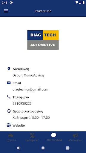 Η εφαρμογή Diag Tech Automotive είναι μια πρωτοποριακή εφαρμογή για τα δεδομένα των συνεργείων της χώρας. Αντικαθιστά το κλασικό βιβλίο συντήρησης του οχήματος με ηλεκτρονικό. Κάθε εργασία που πραγματοποιείται καταχωρείται είτε από εμάς είτε από τον πελάτη. Να σημειωθεί πως η πρώτη καταχώρηση γίνεται υποχρεωτικά απ το συνεργείο μας. Αποστέλλονται ειδοποιήσεις των προγραμματισμένων μελλοντικών εργασιών όπως επίσης και ειδοποιήσεις πιθανών προσφορών για κάποιες περιόδους. Υποστηρίζει ένα και πλέον οχήματα ανά χρήστη. Είναι ένα εργαλείο οργάνωσης του αρχείου συντήρησης τους οχήματος.