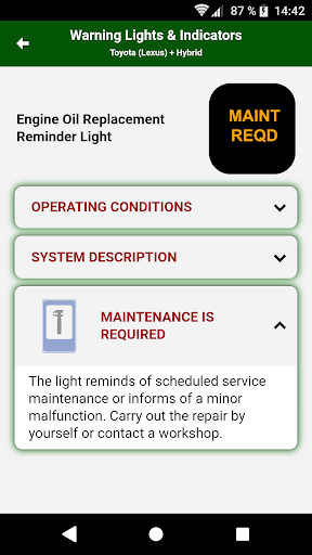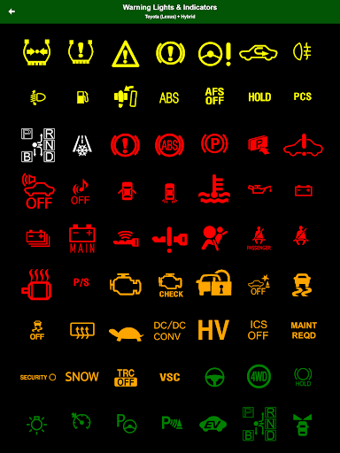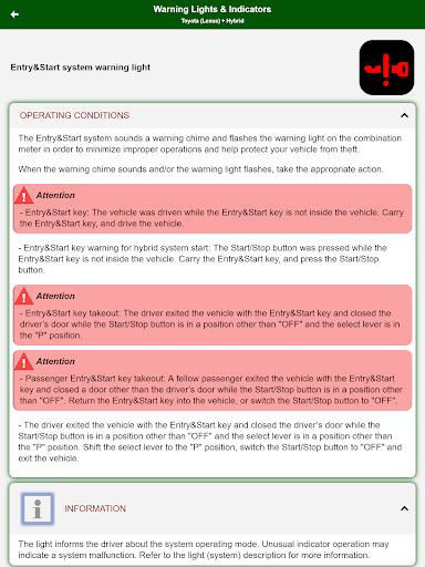 The ‘Reference’ section (available as a paid plugin) contains detailed descriptions of Toyota (Lexus) hybrid car warning and indicator lights. There are descriptions of 147 unique warning lamps now. You not only will know what any of dashboard lamps mean but also get professional advice in case of malfunction. The maintenance of your Toyota Prius, Toyota Camry Hybrid, Toyota Highlander Hybrid, Toyota Estima Hybrid, Harrier Hybrid, Lexus RX 400h, 450h, and other hybrids will be easier.