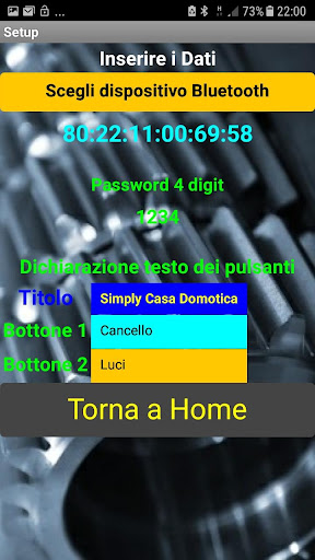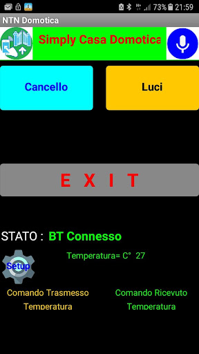 Questa APP permette di trasmettere semplici comandi, tramite il Bluetooth dal tuo cellulare, ad una centrale studiata per ricevere tali dati ed elaborarli per far si che il tuo impianto elettrico a filo diventi flessibile, wireless, trasformandolo in uno domotico.