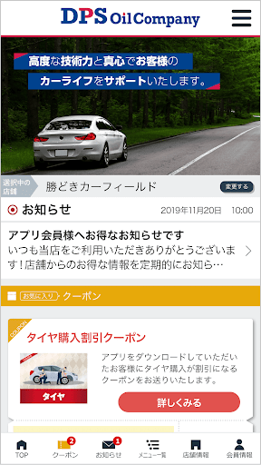 当社の公式アプリ「DPS石油株式会社」ではアプリで簡単に月定額制の洗車放題会員サービスを購入することが可能のほか、当店で利用いただけるお得なクーポンや各種メニューの割引情報を配信しております。