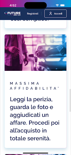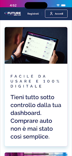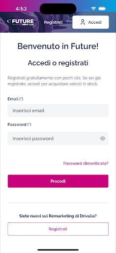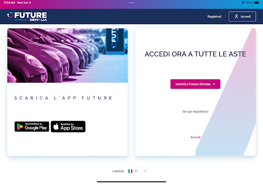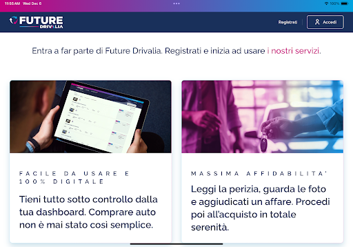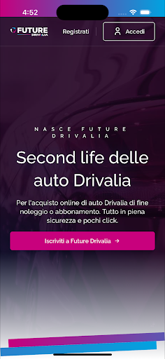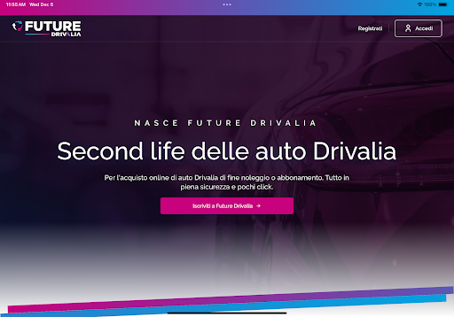 Grazie all’app Future puoi trovare, tra le auto di Drivalia, quella che ti occorre, puoi acquistarla in asta o prenotarla; scegliere tra veicoli di vari brand automobilistici provenienti dalle diverse tipologie di noleggio. DRIVALIA è una società che offre servizi di mobilità attraverso soluzioni innovative e tariffe competitive: noleggio a breve, medio e lungo termine, abbonamenti e car sharing, rivolti sia a privati che ad aziende di ogni dimensione.