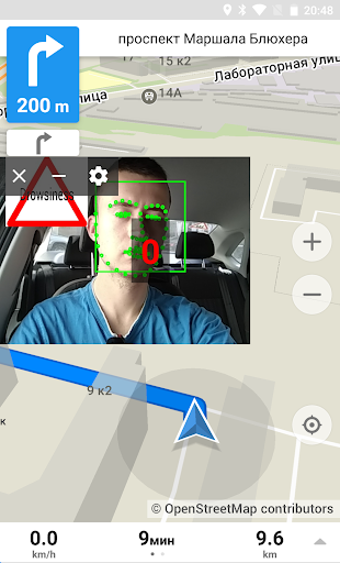 The application works in parallel with the user navigation system installed on the smartphone and does not interfere with the receiving incoming calls and messages. The first time the driver is asked to calibrate the position of the head. To calibrate you need to mount smartphone on the windshield for further use, press the calibration button, and look forward to the road for 10 seconds. After launching the application window in a standalone overlay mode, the user will see the usual navigation system and the application window on top of it (which can be hidden from the screen so as not to overlap the map or other applications).